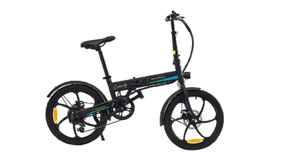 La primera toma de contacto con esta eBike, disponible en negro y blanco, es buena. Es la más ligera de las tres (18,5 kg) y plegada ‘nos deja’ las siguientes dimensiones: 850 x 450 x 640 mm. Provista de un cuadro general de aleación de aluminio, comparte con sus oponentes algunas características como, por ejemplo, ruedas de 20 pulgadas, motor sin escobillas de 250 vatios que ofrece una buena respuesta, pata de cabra y engranaje de Shimano. Eso sí, no cuenta con guardabarros y la iluminación que proporciona la luz delantera es bastante pobre.