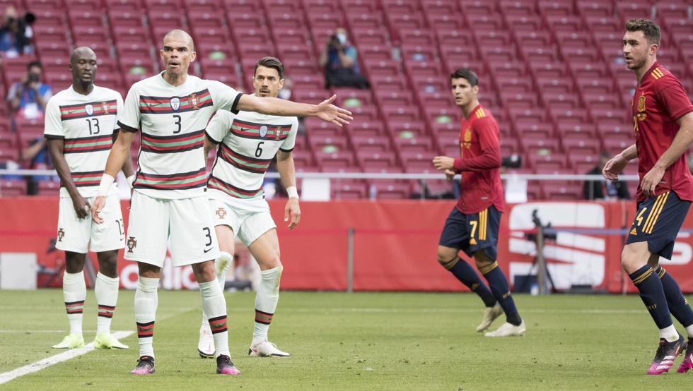 Un once que desde el primer momento encerró a la Portugal de un pitado Cristiano en su campo. Todo eso para deleite de los casi 15.000 aficionados que volvieron a animar a la Roja y también a pitar a Cristiano Ronaldo cada vez que tocaba el balón. Eso sí, lo hizo poco porque Portugal no existió en los primeros 20 minutos. España mandaba por completo y con Sarabia y Ferran Torres por bandas volvía loca a una Portugal en la que Pepe, a sus 38 años, era el mejor.