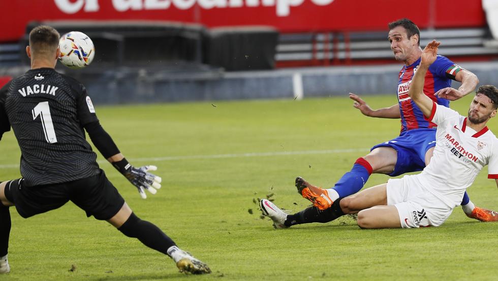 El Eibar se presentó en la capital andaluza con la lección muy aprendida y, al igual que la temporada pasada, generó enormes problemas al Sevilla. Con el paso de los minutos fue sintiéndose cada vez más cómodo sobre el césped hasta que en el minuto 40 Diop asistió de forma brillante al primer toque a Kike García para que este no perdonase ante Vaclik.