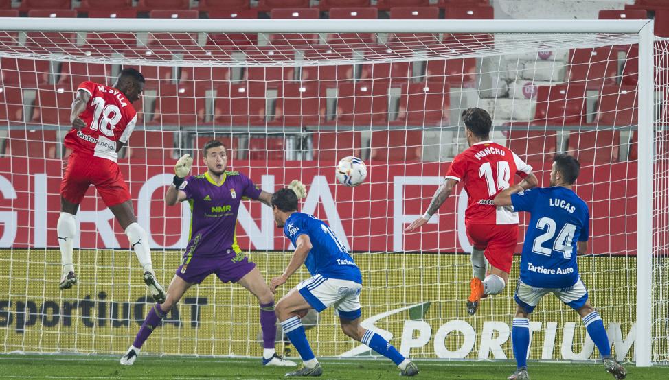 Los asturianos intimidaban con asfixiar al Girona en la salida de balón, pero rápidamente se replegaban para evitar que Samu, Monchu y Gumbau pudieran recibir entre líneas.