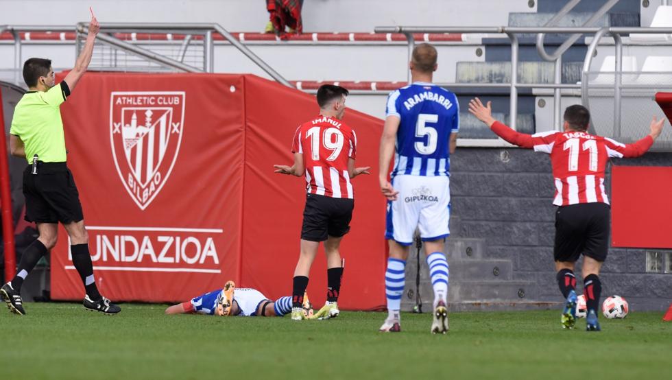 El derbi de filiales disputado hoy a la mañana en Lezama ha caído del lado de la Real Sociedad B. El Bilbao Athletic ha encarado mucho mejor el partido, pero se ha visto seriamente penalizado por una roja directa muy rigurosa que ha visto el lateral izquierdo Imanol a la media hora de juego por una entrada sobre Petxarroman. Joseba