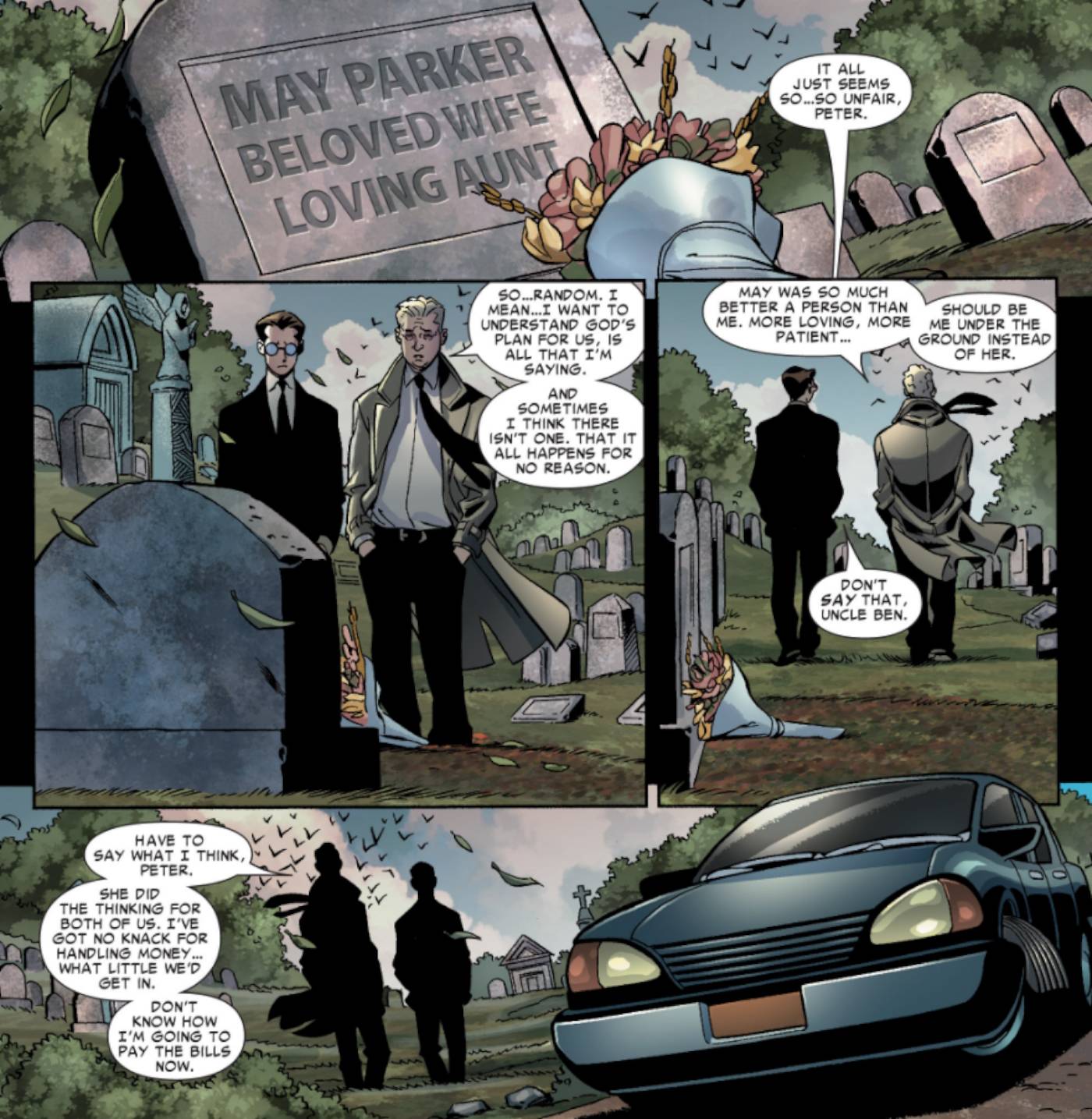 - La muerte de la tía May altera el camino de Spider-Man, lo que lleva a un Peter Parker violento y egocéntrico sin la lección de responsabilidad del tío Ben.