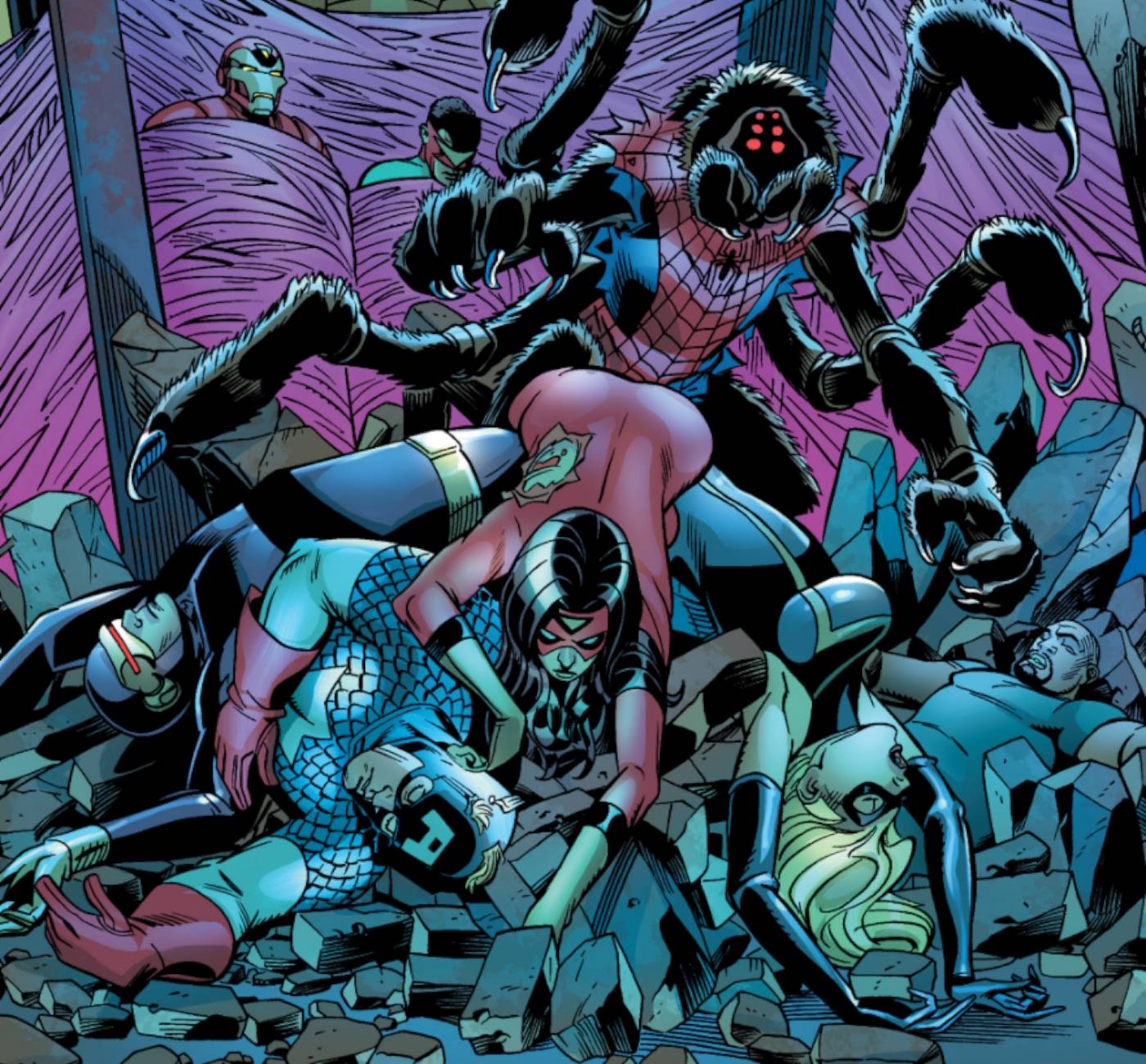 - Sin aprender su lección más importante, Spider-Man se convierte en un monstruoso Hombre-Araña que ataca y mata a los Vengadores.