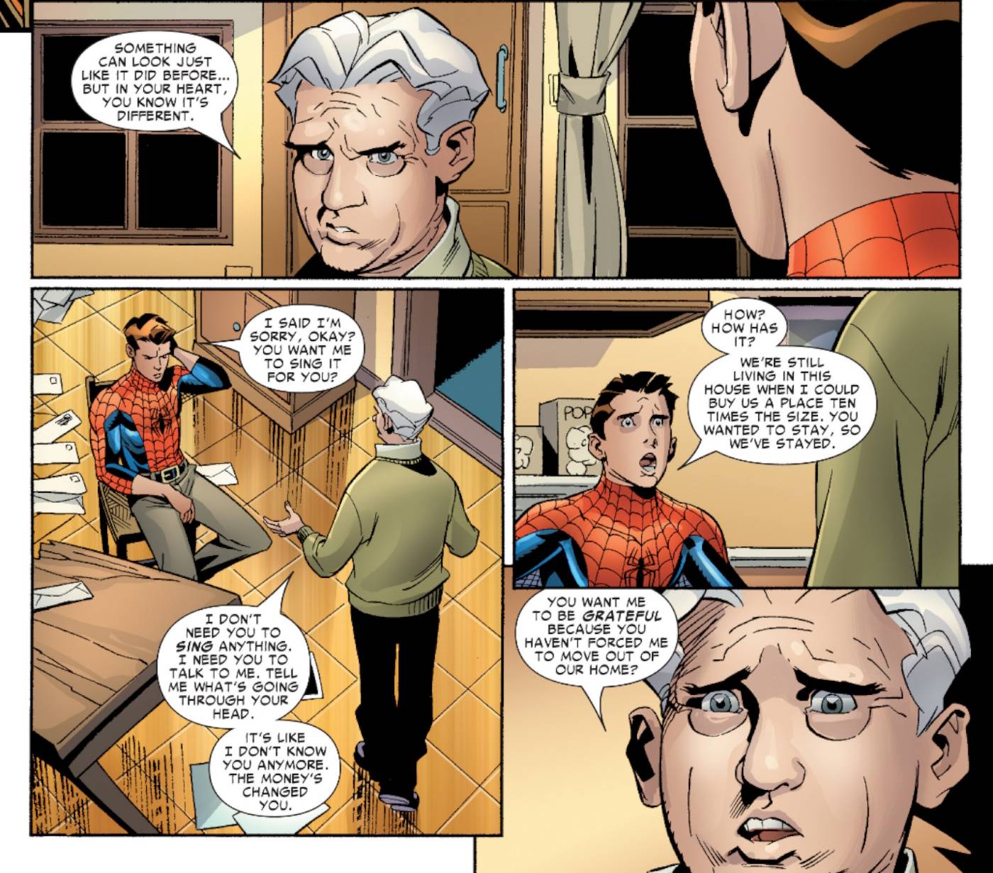 La muerte del tío Ben es un momento importante en la vida de Peter y le enseña que su poder conlleva responsabilidad. Debido a que la muerte de la tía May es más bien un extraño accidente, él nunca aprende esta lección, y como el tío Ben necesita dinero para continuar, no ve ninguna razón por la cual su poder no debería beneficiarlos. Esto lo convierte en un Peter Parker mucho más violento y egocéntrico, a quien en realidad solo parece importarle salir adelante en la vida. Como señala el tío Ben, Peter parece completamente obsesionado con sí mismo, sin ningún deseo de ayudar a nadie a su alrededor.