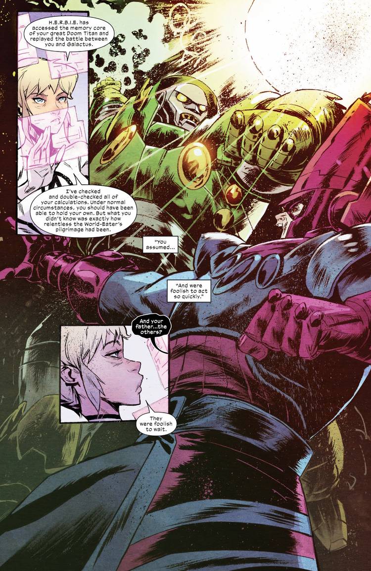 - El genio del Doctor Doom está en plena exhibición cuando se enfrenta a un Galactus loco, mostrando sus incomparables habilidades.