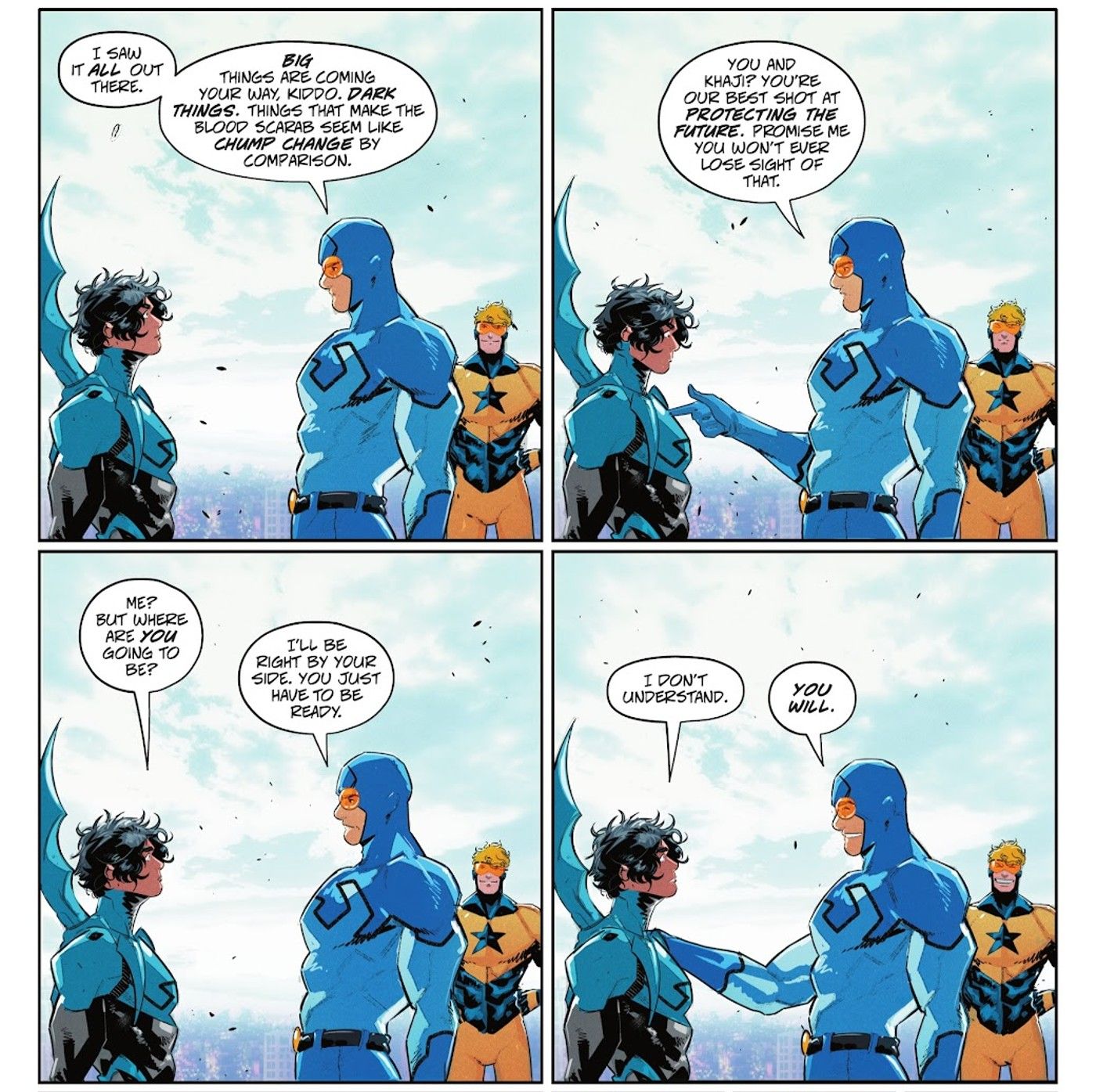 Escarabajo azul #7 de Josh Trujillo, Adrián Gutiérrez, Wil Quintana y una gran cantidad de artistas clásicos de Blue Beetle envía a Jaime Reyes a través del tiempo en busca de su predecesor, Ted Kord. Esencialmente disperso en el tiempo, el segundo Blue Beetle finalmente se reúne con Jaime. Sin embargo, la reunión no es necesariamente feliz, ya que Ted advierte a su amigo de una gran oscuridad que se avecina hacia ellos después de ver el futuro.