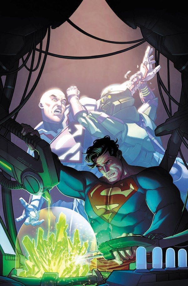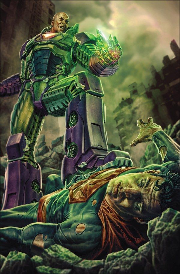 - La portada variante presenta a Lex Luthor, vestido con su imponente traje de guerra y blandiendo kriptonita mientras se cierne sobre un Superman derrotado.