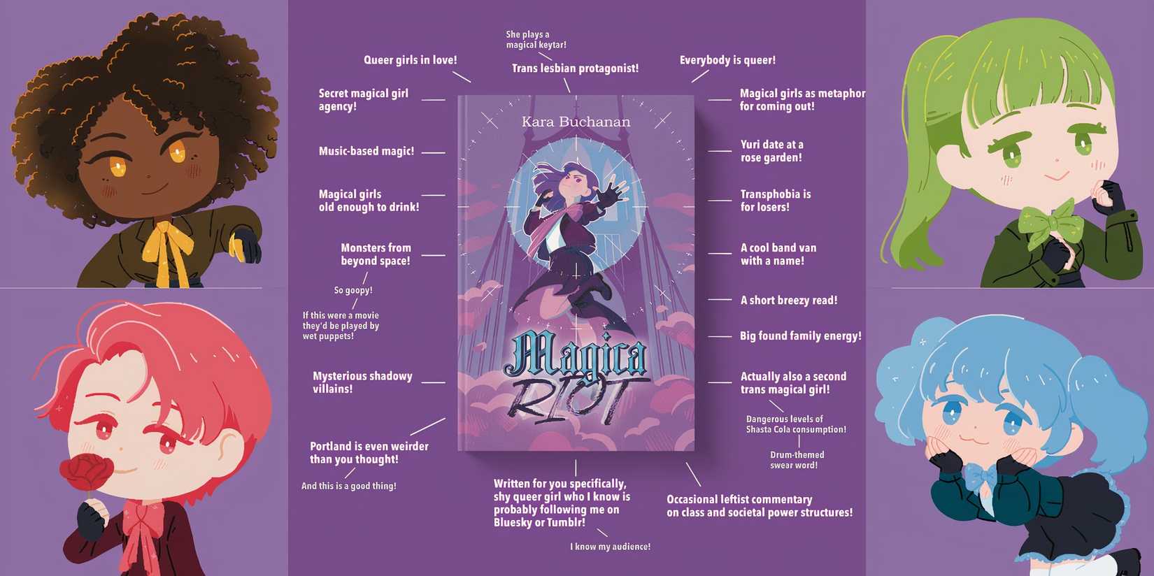 Al igual que el personaje principal Claire Ryland, Buchanan ha pasado por una transformación que terminó con ella en una banda. – aunque el suyo involucró muchos menos ataques de monstruos gigantes. Kara, junto con su esposa, Steph Buchanan, y su amiga Rowan Church forman Crystal Furs, un trío queer de indie-pop con sede en su ciudad natal de Portland, Oregon. ¡Disturbios Mágicos! se basa en gran medida en sus propias experiencias como músicos en Portland, hasta varias escenas que hacen referencia a algunos de los locales musicales de la ciudad.