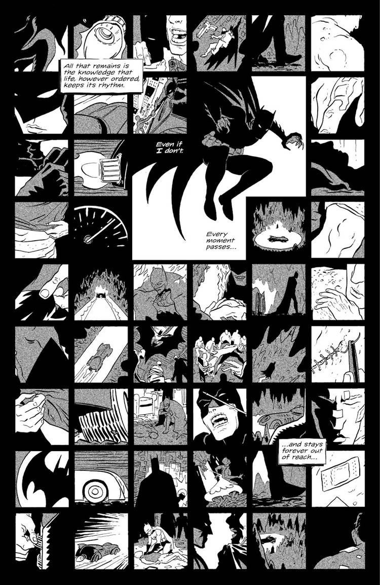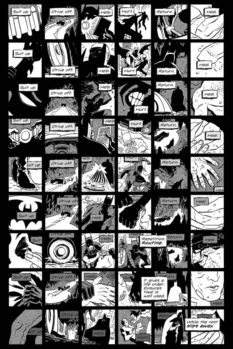 En Batman: el valiente y el audaz #14, la historia de Hayden Sherman “The Evidence Remains” toma la fórmula básica de una historia de Batman y la presenta en una sola página. Como escribe Sherman, el cómic típico de Dark Knight se puede resumir en seis sencillos pasos: “Vístete. Ahuyentar. Ayuda. Herir. Devolver. Sanar.“
