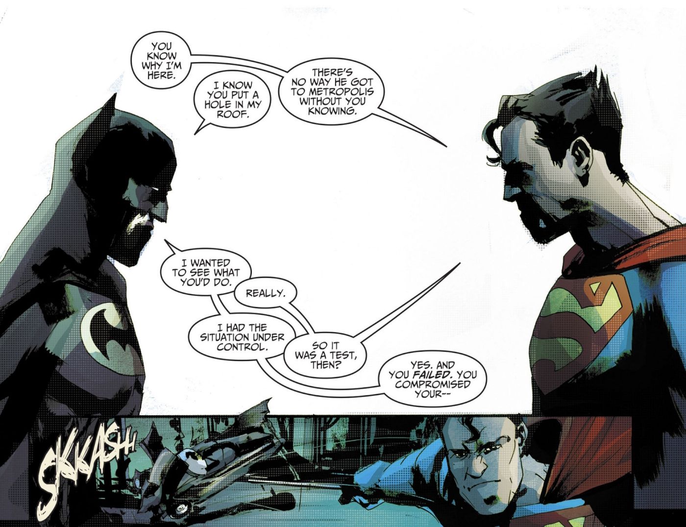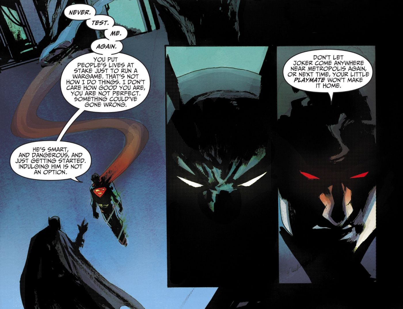 El Joker no podría haber dejado Gotham y haber llegado a Metrópolis sin que Batman lo supiera. Superman acusa a Bruce de ello y tiene razón. Batman permitió intencionalmente que el Joker fuera a Metrópolis para ver la postura de Superman sobre no matar. Dado que Superman amenazó abiertamente con matar al Joker, Batman considera que esto es una prueba fallida y, por lo tanto, cree que no se puede confiar su poder al Hombre de Acero. Superman, sin embargo, responde que el Joker es peligroso y que cada vez es más peligroso. No se puede permitir la locura del Joker; la única forma de lidiar con él es detener su acto y recordarle que sus acciones tendrán duras consecuencias. Batman no está de acuerdo, y después de un acalorado intercambio, los dos toman caminos separados, y Superman promete matar al Joker si se lo encuentra nuevamente.