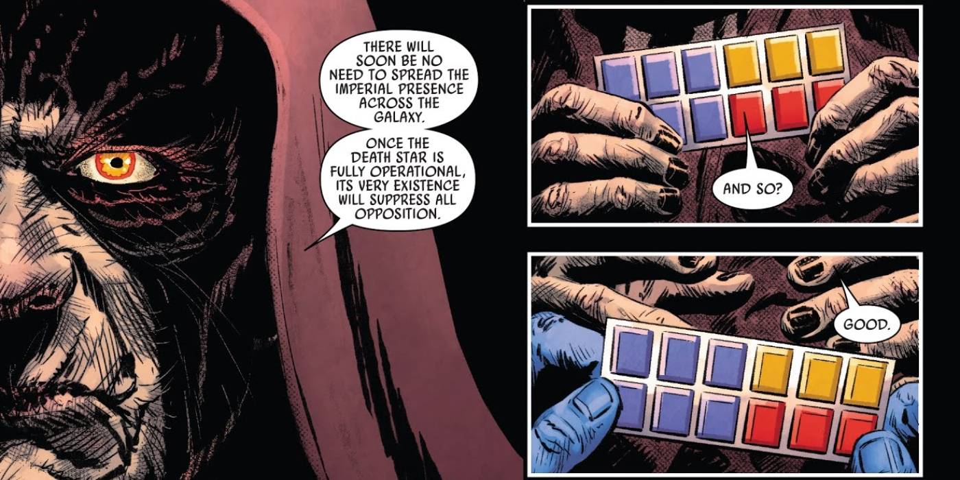 En Darth Vader vol. 2 #8 de Charles Soule y Giuseppe Camuncoli, Darth Vader y Palpatine se encuentran en la oficina del Emperador en Coruscant, castigando a un oficial imperial que no estuvo a la altura de las expectativas de los Sith. Cuando termina la reprimenda del coronel, Darth Vader lo libera de su estrangulador de Fuerza, momento en el que Palpatine comenta que Vader casi mata al hombre. El Emperador admite que empatiza con la sed de violencia de Vader, especialmente ahora que los Jedi ya no existen, pero Palpatine termina diciendo: “No deseo gobernar una galaxia de muertos.”.