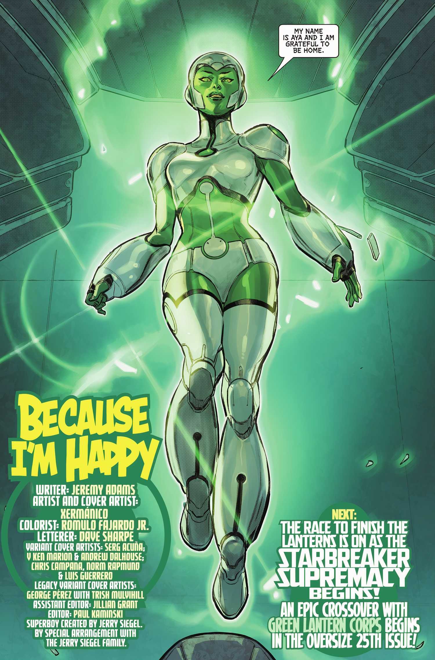 Los héroes luchan y, en el proceso, rompen la maquinaria que contiene la poderosa energía, que se dirige directamente al barco de la linterna verde, el interceptor. La energía se dirige a la nave y comienza a construirse un cuerpo. Una vez completo, La figura brillante se presenta como Aya y le dice a las linternas verdes que está feliz de estar en casa..