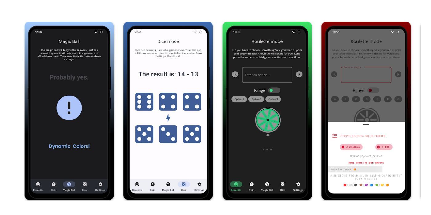 Entonces, si bien la premisa no toma en cuenta cosas como el dinero como algunas de las mejores aplicaciones de presupuesto que existen, aún brinda a los usuarios lanzadores de monedas, hilanderos, dados y todo otro tipo de herramientas clásicas para ayudar. Hay otras aplicaciones disponibles como esta, aunque ésta, al menos, coloca todas las diferentes opciones en un solo espacio, en lugar de requerir que los usuarios descarguen más de una aplicación.