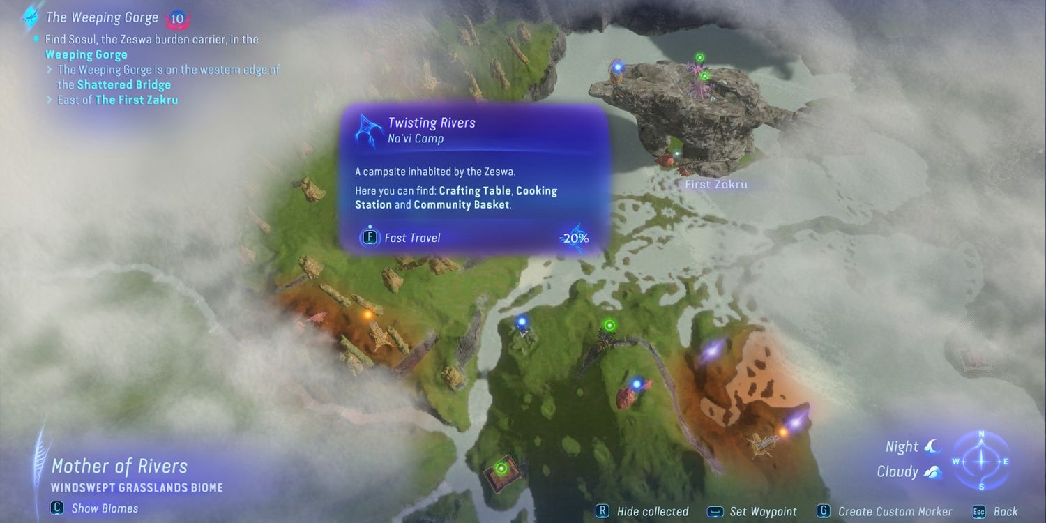 Seleccionar una opción de viaje rápido en el Avatar: Fronteras de Pandora El mapa deja claro que tomar un atajo gastará recursos, con un cociente de reducción junto al símbolo de un ikran. Si esto parece confuso, la respuesta es simple: El recurso que se está agotando es la resistencia de ikran.. Esto no es un problema particularmente importante, ya que no es tan difícil recargar, aunque el uso excesivo de viajes rápidos en última instancia restará espacio a la exploración de Pandora en su conjunto.