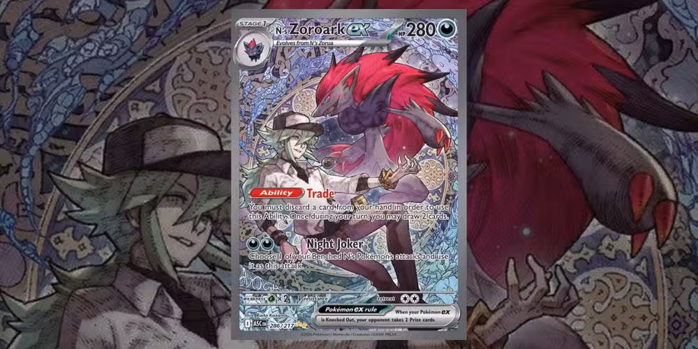 Una de las cartas Pokémon de los entrenadores más populares. En el set, “N’s Zoroark ex” incluye tanto a N como a Zoroark ex en su ilustración, con ambos personajes mirando amenazadoramente al titular de la tarjeta. El Pokémon de tipo Oscuro y su entrenador están centrados en el centro de un hermoso borde circular que combina temas góticos y florales de una manera llamativa.