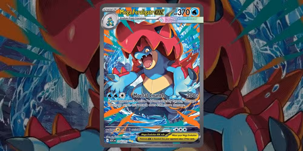 Mega Feraligatr ex recibirá su propia Mega ex Box este abrilque contará con una tarjeta promocional especial con arte alternativo. Sin embargo, cualquiera que tenga la suerte de sacar esta versión rara con ilustración especial de “Mega Feraligatr ex” mientras tanto debería considerarse afortunado. La obra de arte de esta impresionante carta parece llamar tu atención, con Mega Feraligatr ex adoptando una pose poderosa.