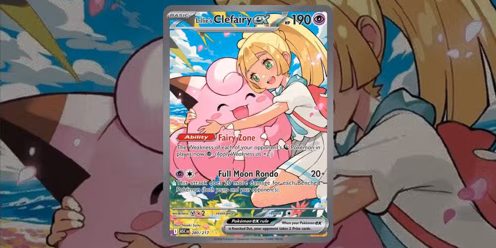 Las cartas Pokémon del entrenador a menudo parecen estar entre las más valiosas y, en este caso, “Lillie’s Clefairy ex” no solo tiene un gran valor, sino que también es una carta simplemente adorable a la vista. Esta obra de arte de tarjeta completa muestra a Lillie abrazando a un sonriente ex de Clefairy. quien le devuelve el abrazo con una pata. En última instancia, los dos parecen un ejemplo perfecto de cómo debería ser la amistad entre un Pokémon y su Entrenador, incluso para un Pokémon alienígena extraño.