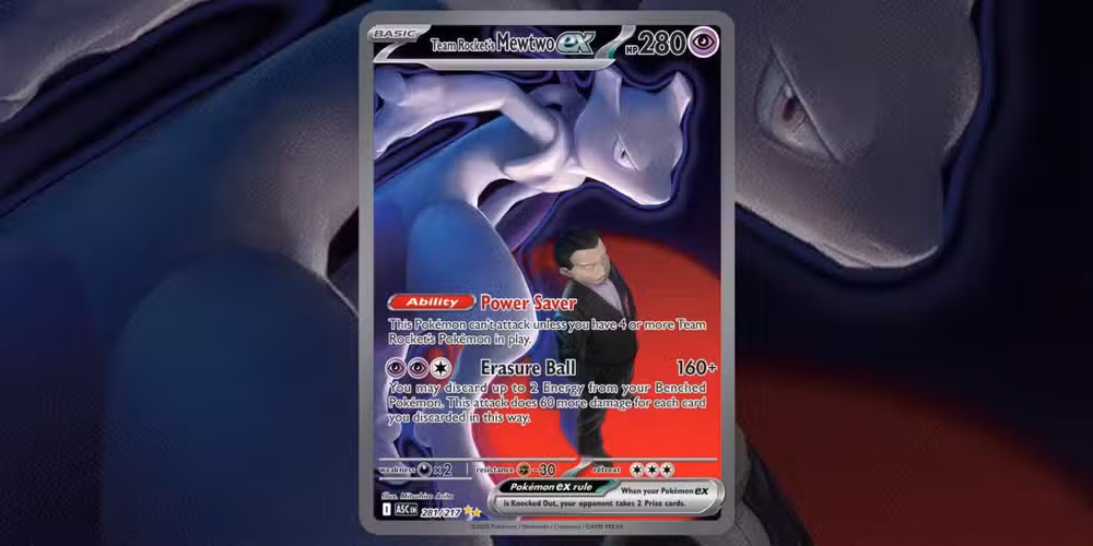 En marcado contraste con las alegres imágenes de Lillie y Clefairy ex, aquí tenemos al “Mewtwo ex del Team Rocket” con el jefe del Team Rocket, Giovanni, parado en un foco rojo con el ex de Mewtwo eclipsándolocasi como si desafiara a alguien a acercarse más a Giovanni. Los colores oscuros e incluso la energía que parece desprenderse de Mewtwo ex se suman a la vibra siniestra detrás de la carta, lo que realmente encaja con el líder del Equipo Rocket.