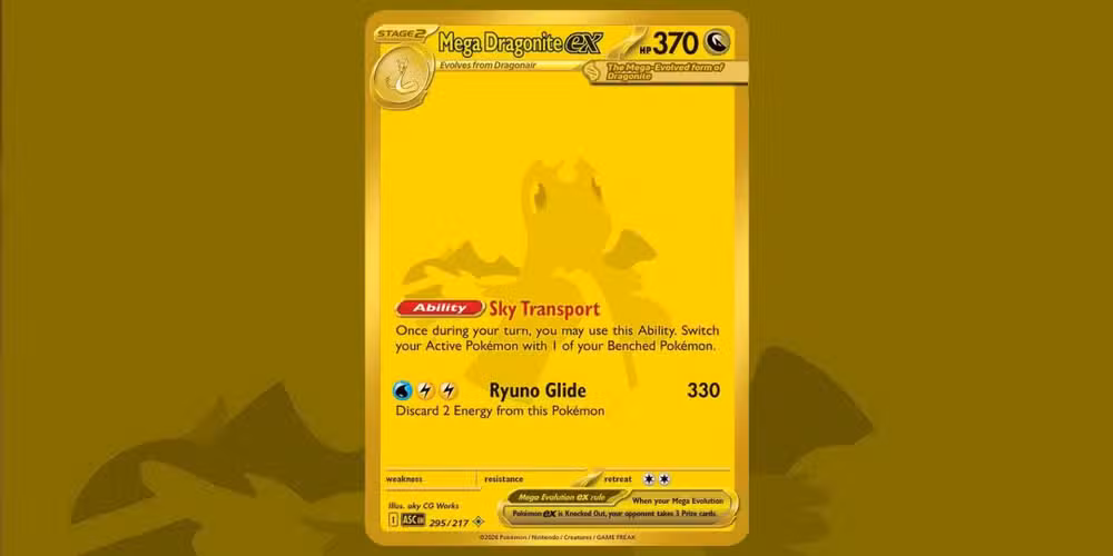 Una de las cartas Mega Hyper Rare con ilustraciones doradas monocromáticas, este “Mega Dragonite ex” apenas es visible en su carta, y solo sus expresivos ojos se ven a través de su cara. Este estilo especial de imágenes hace que estas tarjetas realmente se destaquen del resto.y de alguna manera se sienten aún más impresionantes que aquellos con ilustraciones intrincadas que cubren cada centímetro.