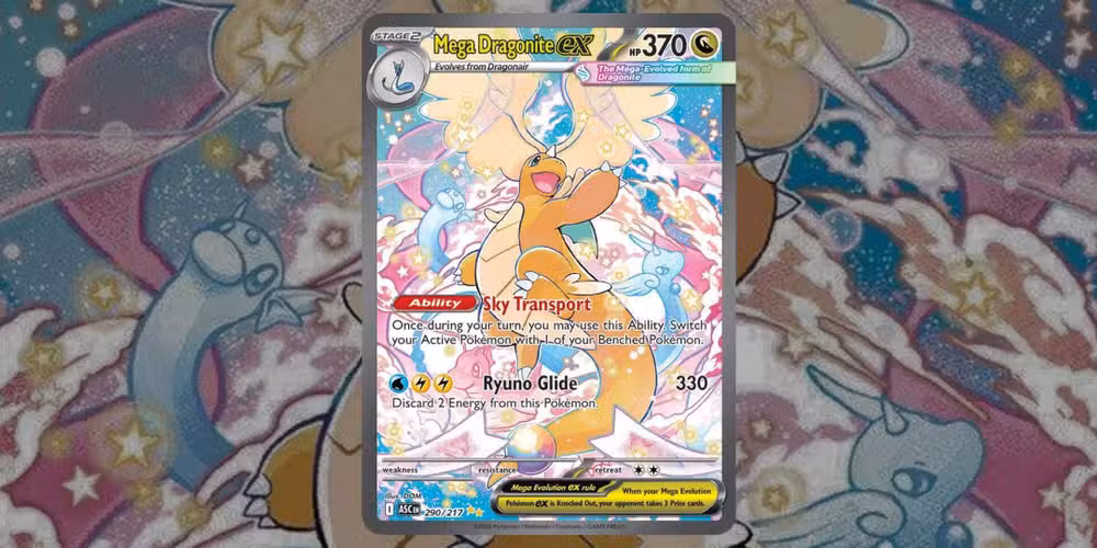 Mega Dragonite ex es lo más destacado del Héroes ascendidos conjunto, adornando la portada de la popular Elite Trainer Box para el set con la descripción de cómo lleva a sus compañeros Pokémon a la batalla. Esta tarjeta presenta hermosas ilustraciones en colores pastel con Dragonair y Dratini arremolinándose detrás de ella en medio de estrellas arremolinadas.