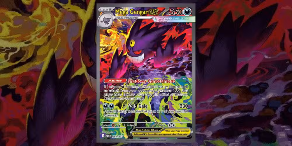 Con solo echar un vistazo a esta ilustración especial rara de “Mega Gengar ex”, quedará claro qué la convierte en una adición tan popular y valiosa a este conjunto. Los impresionantes colores que rodean a Mega Gengar ex son vibrantes y fascinantes.con la sensación de múltiples tormentas convergiendo sobre el Pokémon de tipo Oscuro. Es verdaderamente una obra de arte y muestra de manera experta el poder y la amenaza de Mega Gengar ex.