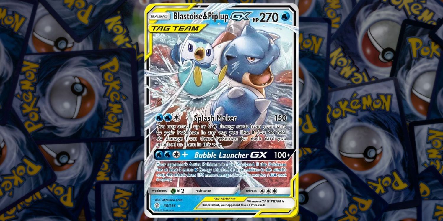 Este Pokémon JCC tarjeta de la Eclipse cósmico de sol y luna el set presenta al equipo de etiqueta de Blastoise y Piplup y es un Ultra Raro. La obra de arte en la tarjeta tiene una energía que se siente como si estos dos tipos de agua pokémon van a saltar fuera de ella. Cuenta con el ataque especial “Bubble Launcher GX” y esta tarjeta de holofoil tiene un valor actual de $ 10.78 USD en TCGplayer.