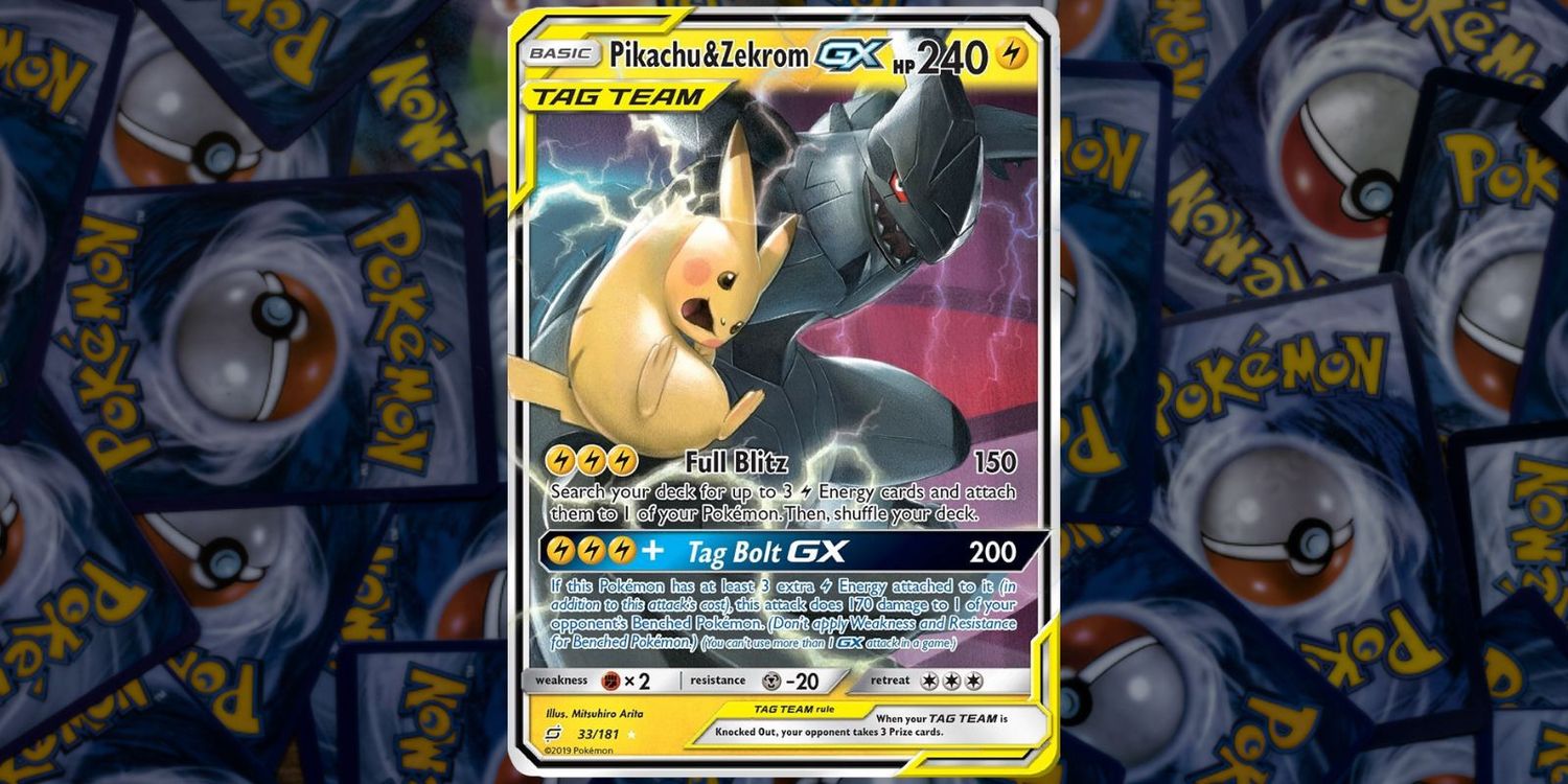 pokémonLa mascota favorita de Pikachu une fuerzas con Zekrom en este JCC tarjeta. viniendo de la Pokémon TCG: Sol y Luna se unen set, Pikachu & Zekrom GX es otra carta de holofoil ultra rara y tiene un valor de $ 7.19 USD en TCGplayer. Sus relámpagos crepitantes en el diseño de la carta entran en juego con el ataque especial “Tag Bolt GX” en la carta y logran que incluso el adorable Pikachu parezca un poco más amenazador junto con el oscuro Zekrom.