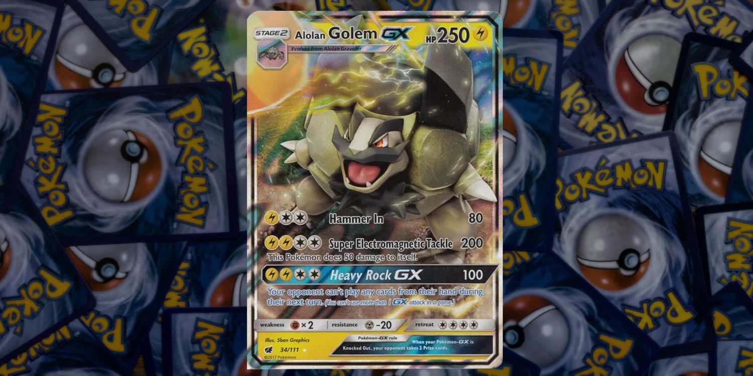 El gólem de Alola GX Pokémon JCC la tarjeta viene de sol y luna‘s invasión carmesí expansión y está catalogado como Ultra Raro. Su ataque especial es un “Heavy Rock GX”, pero a pesar de esto, su hermosa obra de arte parece demostrar algunas de las habilidades electromagnéticas y hace referencia a la fuerza de tipo Rayo del Pokémon. A pesar de ser una carta bonita, este holofoil actualmente solo tiene un valor de $ 2.72 USD en TCGplayer.