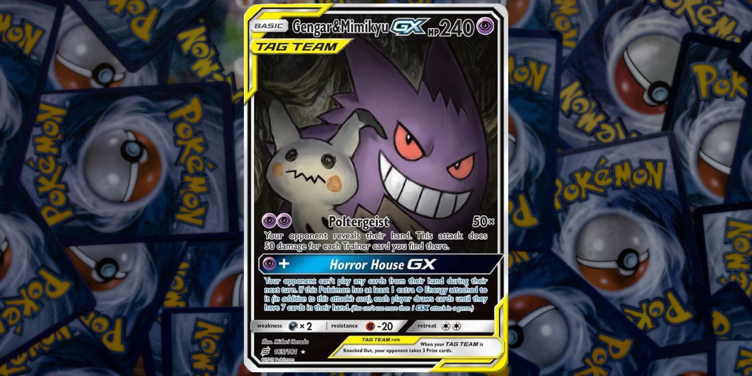 Los espeluznantes tipos psíquicos Gengar y Mimikyu se presentan aquí con esta variedad alternativa de arte completo de Gengar y Mimikyu GX. Pokémon JCC tarjeta. Debutaron como parte de la Sol y Luna se unen juego de cartas y son una de las cartas más valiosas, actualmente valoradas en $ 410.00 en TCGplayer. Ilustrado por Midori Harada, su apariencia fantasmal se manifiesta en esta hermosa obra de arte. La tarjeta presenta el movimiento de ataque especial “Horror House GX”.