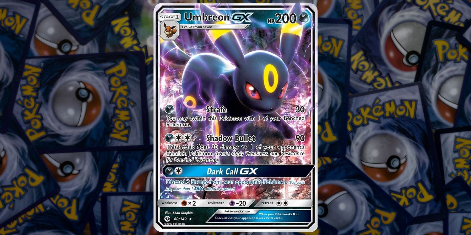 Umbreon es una de las muchas evoluciones de Eevee, el favorito de los fanáticos, y se muestra en este Umbreon GX. Pokémon JCC tarjeta de la sol y luna conjunto base con un aura morada a su alrededor. La tarjeta Ultra Rare solo tiene un valor de $ 5.20 USD en TCGplayer y proporciona el ataque “Dark Call GX”. Los colores de esta carta la hacen realmente destacar, con el brillo y la vitalidad de su diseño y el púrpura que resuena con el Umbreon de tipo oscuro.