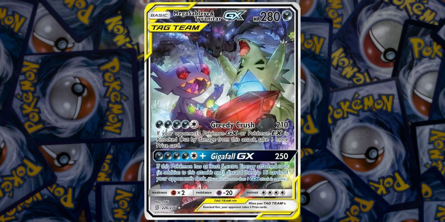 El arte completo alternativo de Mega Sableye y Tyranitar GX en esta carta hace un buen trabajo al mostrar las personalidades de cada uno de estos Pokémon. La tarjeta proviene del Pokémon TCG Sol y Luna‘s Mentes unificadas expansión y da a los jugadores el uso del ataque “Gigafall GX”. Este holofoil ultra raro tiene un valor de $ 269.69 en TCGplayer.