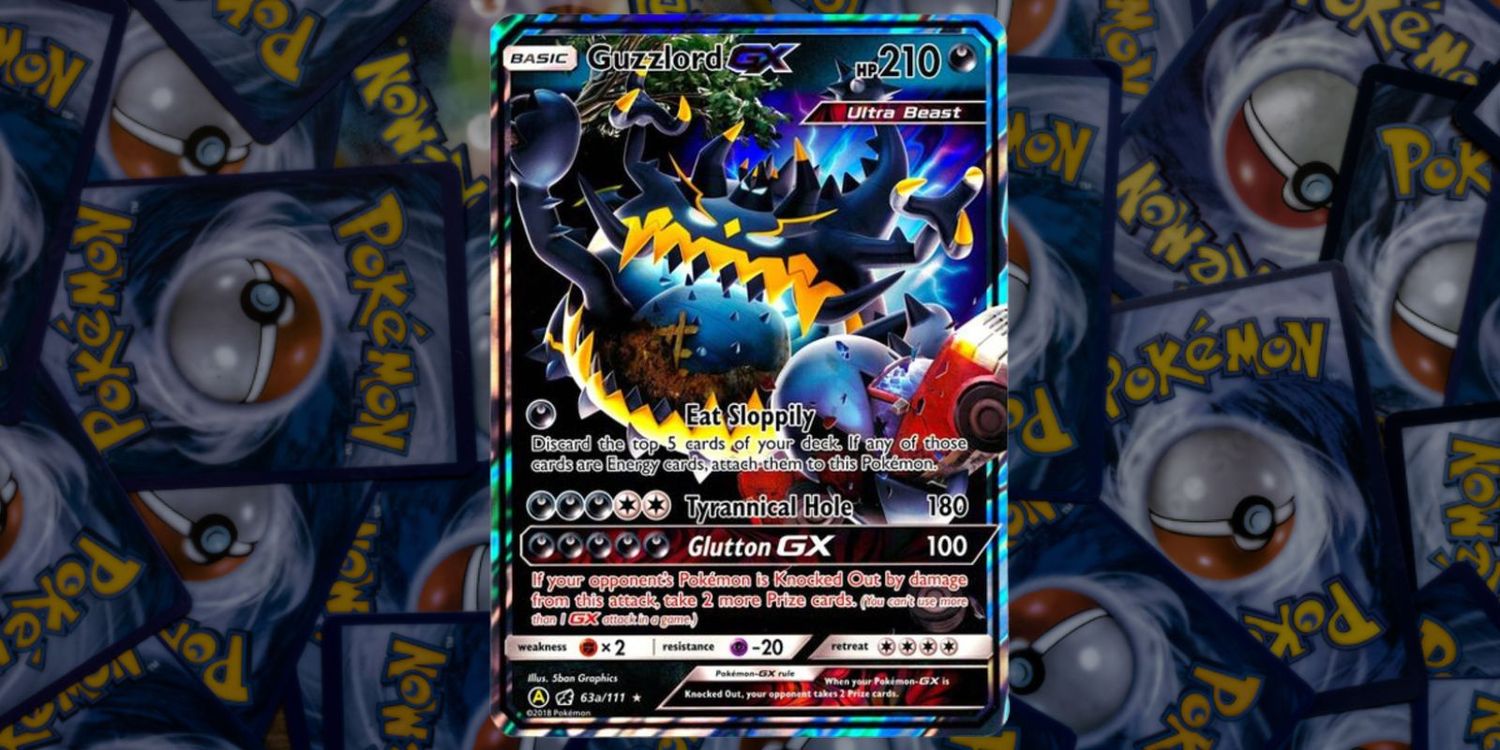 Uno de Pokémon JCCLas tarjetas promocionales de arte alternativo de Guzzlord GX son una tarjeta brillante que muestra el poder que tiene Guzzlord para aplastar fácilmente un camión y más en esta obra de arte de 5ban Graphics. La tarjeta de holofoil solo tiene un valor de $ 3.00 en TCGplayer, pero el arte bonito, aunque amenazante, es divertido de ver con tanto detalle puesto en él. La carta proporciona un ataque “Glotón GX” que se representa de manera efectiva en la comida glotona del Guzzlord en la ilustración.