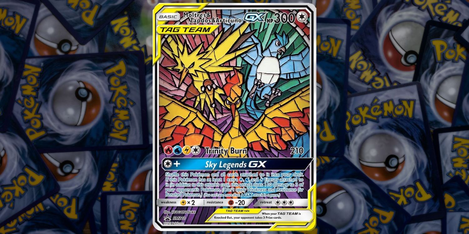 Moltres, Zapdos y Articuno adornan este Tag Team Pokémon JCC tarjeta de la sol y luna promociones Una hermosa carta con un artístico efecto de vidrieras en la ilustración de HYGONOSUKE, el trío de pájaros brinda a los jugadores un ataque “Sky Legends GX”. Presentado usando el estilo de vidrieras en el arte le da a este trío una sensación aún más legendaria además de la mezcla colorida. Con un valor de solo $ 11.99 en TCGplayer, la tarjeta de holofoil es bonita y también es más asequible que muchas de ellas.