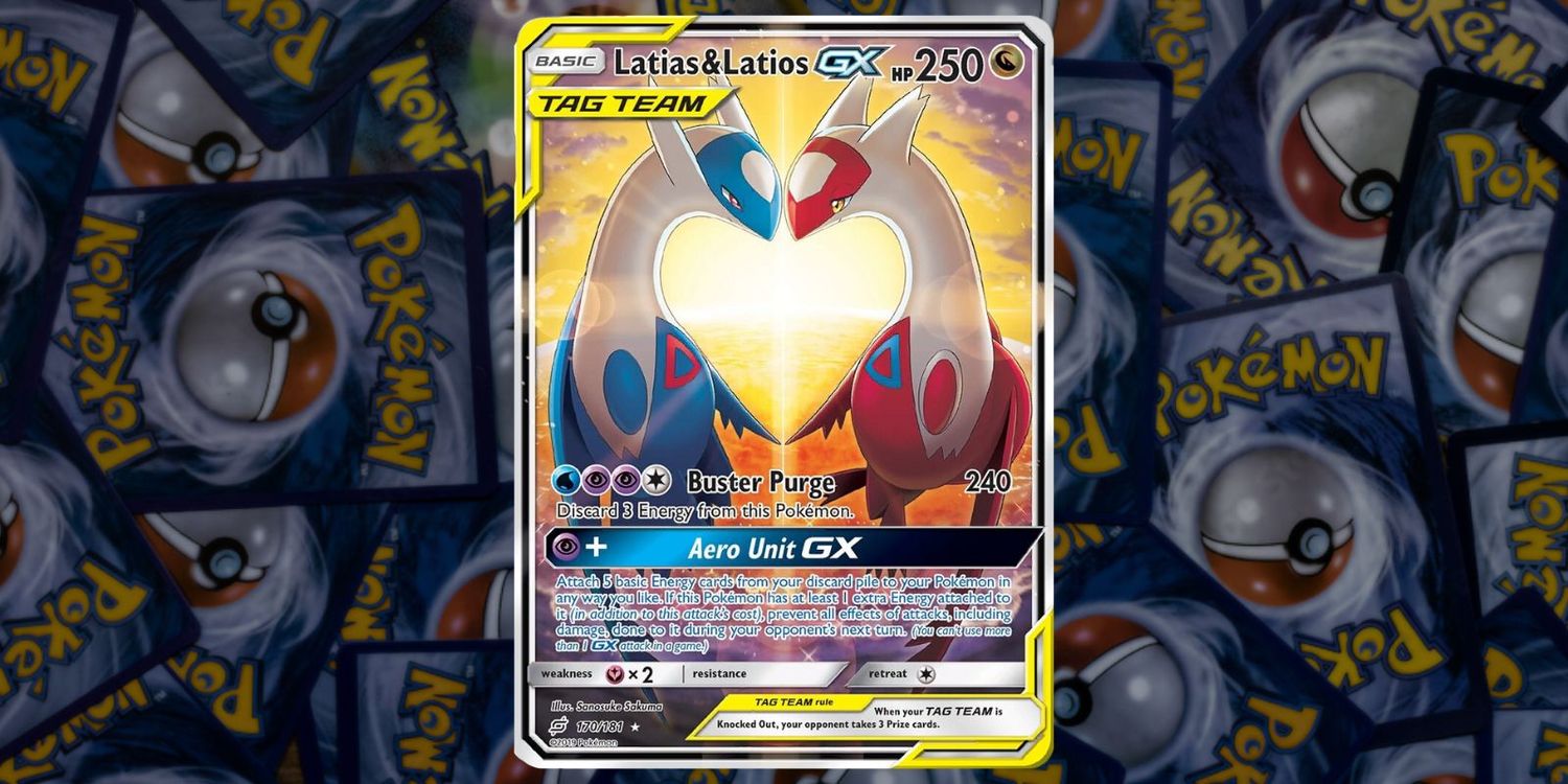 Pokémon JCCLos hermosos gemelos Lati de son hermanos con una fuerte conexión que se representa maravillosamente en esta tarjeta de la Sol y Luna se unen expansión con un espacio en forma de corazón entre los dos. La tarjeta Alternate Full Art de Latias & Latios GX es una Ultra Rara que también es muy costosa, con un valor de $ 799.99 en TCGplayer. El dúo da un ataque muy poderoso de “Unidad Aero GX” que la convierte no solo en una carta impresionante por su ilustración, sino también en una carta útil para tener en el juego.
