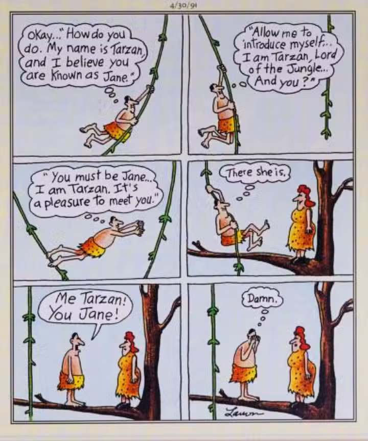 en este clasico Lado lejano La caricatura de Tarzán, Gary Larson, captura brillantemente la experiencia de practicar una conversación en tu cabeza, solo para fallar por completo en las palabras cuando llega el momento de decirlas. En una secuencia de paneles, se muestra a Tarzán descubriendo cómo presentarse a Jane mientras se acerca para encontrarse con ella.