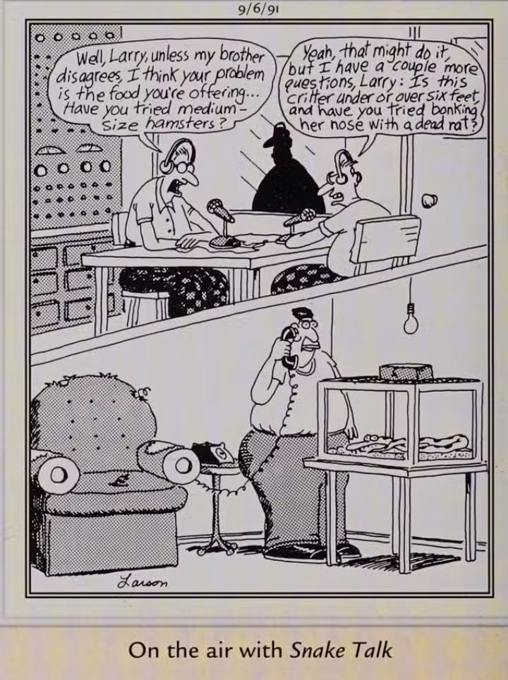 La radio hablada alcanzó su apogeo en la década de 1990, y esto Lado lejano En la caricatura de principios de la década, Larson aparentemente sugiere que, si bien había llegado al punto en que había un programa de radio para casi todos, los aficionados a las serpientes como él todavía no tenían representación en las ondas. Y si lo hicieran, podría sonar como “Charla de serpiente.”