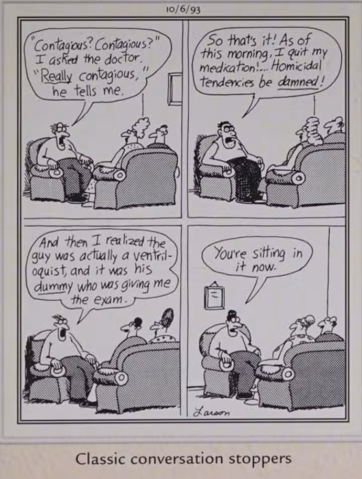 Aquí, Gary Larson evoca lo que el título llama “tapones de conversación clásicos,” una secuencia de proclamaciones cada vez más desquiciadas en las que un hombre revela casualmente que tiene un “enfermedad muy contagiosa,” y otro admite que dejó de tomar sus medicamentos para su “tendencias homicidas,” mientras que el siguiente ofrece otro extraño Lado lejano chiste de ventrílocuo.