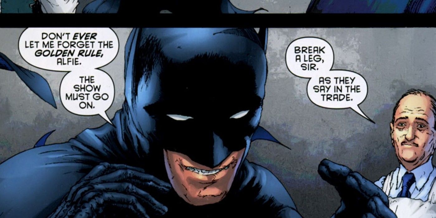 “/> Dick Grayson luchó por ser Batman al principio de su época bajo la capucha, hasta que Alfred le explicó que el problema no era exclusivo de Dick. El problema era que Grayson se estaba esforzando demasiado en emular al hombre que originó el papel. Alfred le dijo a Dick que el secreto para superar a Batman es hacer suyo el papel, al igual que el último actor en interpretar a James Bond o Hamlet debe encontrar una manera de destacarse del resto. Una vez recuperada la confianza, Dick Grayson recordó que en todas las cosas, “el show debe continuar,” una línea que le repite a Alfred, sonriendo de una manera que enfatiza ala nocturna deseo revitalizado de ser su propio héroe.