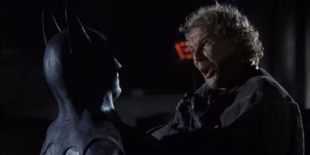 Tim Burton Ordenanza comienza con una escena que inmediatamente define la presencia mítica del héroe. Después de detener a dos atracadores en un tejado de Gotham, Batman (Michael Keaton) lanza a uno por el borde mientras el hombre aterrorizado suplica por su vida. Batman gruñe, “No voy a matarte”.