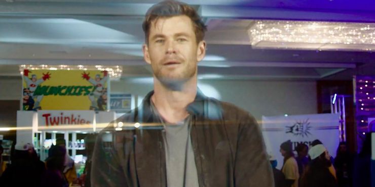 Una escena del segundo acto en la que Milly y sus amigas se burlan de un montón de juegos de palabras sexuales relacionados con Chris Hemsworth se ve recompensada cuando el propio Hemsworth aparece como un holograma que da la bienvenida a la gente a Chronic-Con.