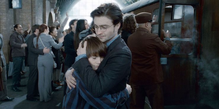 Durante el epílogo al final de la final Harry Potter película, la audiencia ve a Harry aconsejar a su hijo acerca de ir a Hogwarts por primera vez en esta línea.