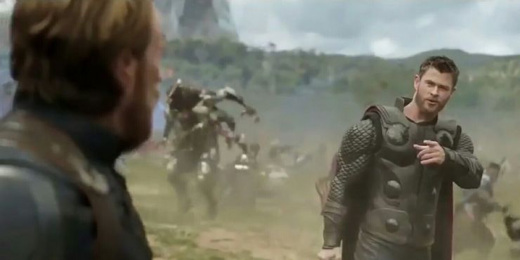 En Vengadores: guerra infinita, durante la Batalla de Wakanda, Thor se toma el tiempo para ponerse al día con su compañero Vengador, el Capitán América, a quien no ha visto desde la película anterior de Los Vengadores.
