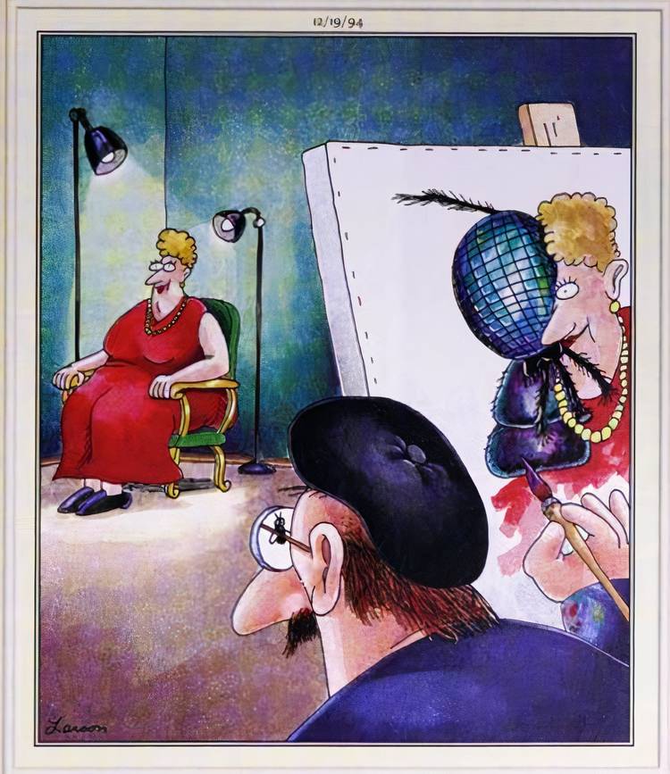 El humor de este panel se basa en un accidente de perspectiva, pero habla de las formas en que Gary Larson evitó deliberadamente la subjetividad de la belleza de forma regular con El otro lado. La caricatura representa una mujer sentada frente a un cuadro, excepto que el pintor aparentemente inconsciente no se da cuenta de que una mosca se ha posado en sus gafas, lo que lo lleva a unir los dos. en su retrato.