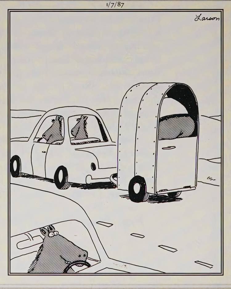 Tomemos, por ejemplo, este panel sin palabras, que presenta caballos conduciendo automóviles en la carretera, con un automóvil con un remolque adjunto y el trasero de un humano sobresaliendo por la parte trasera.. Es un cambio de roles simple y divertido, que será inmediatamente reconocible para la mayoría de los lectores, y eso es lo que lo hace memorable para los lectores.