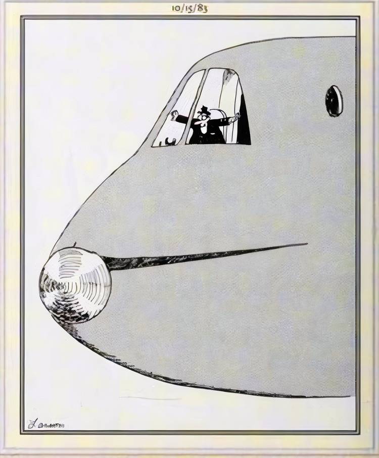 en otro de El lado lejano dibujos animados de aviones más divertidos, la nariz de un jumbo jet ocupa todo el cuadro, brindando a los lectores una vista clara a través del parabrisas delantero hacia la cabina, donde el piloto tiene los brazos extendidos como alas y una sonrisa deliciosamente tonta en su rostro mientras juega a imaginar un avión.a pesar de estar a los mandos de lo real.