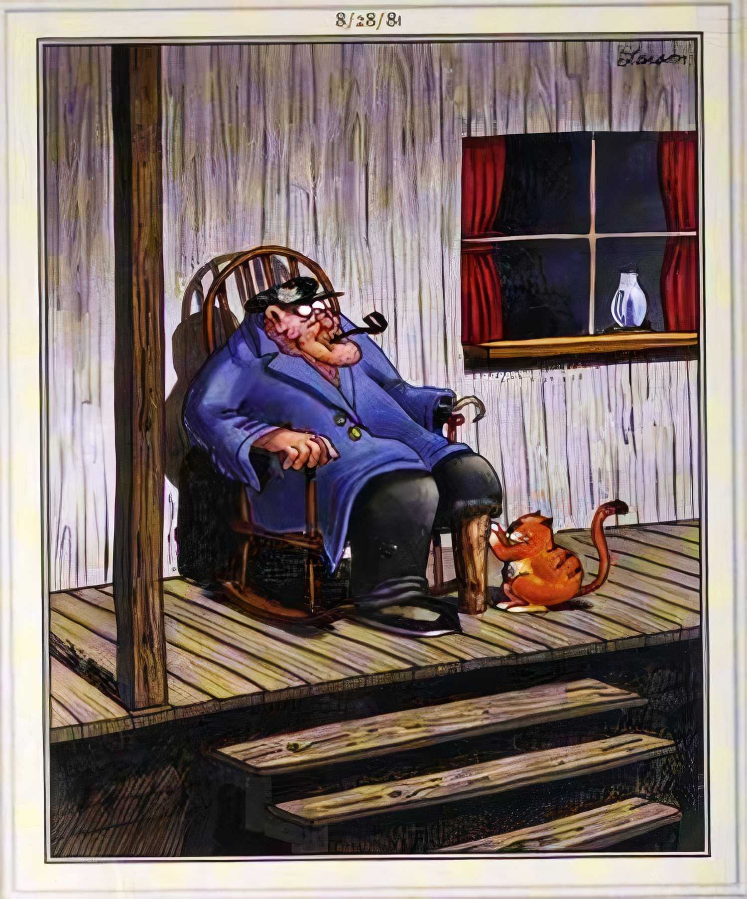 Sin duda, esta es una de las primeras obras más divertidas de Gary Larson. Lado lejano caricaturas publicadas sin título. Una vez más, la sencillez del cómic es su mayor baza. la caricatura presenta a un viejo marinero sentado en la terraza de una casa, fumando su pipa, mientras un gato usa su pata de palo como rascador.