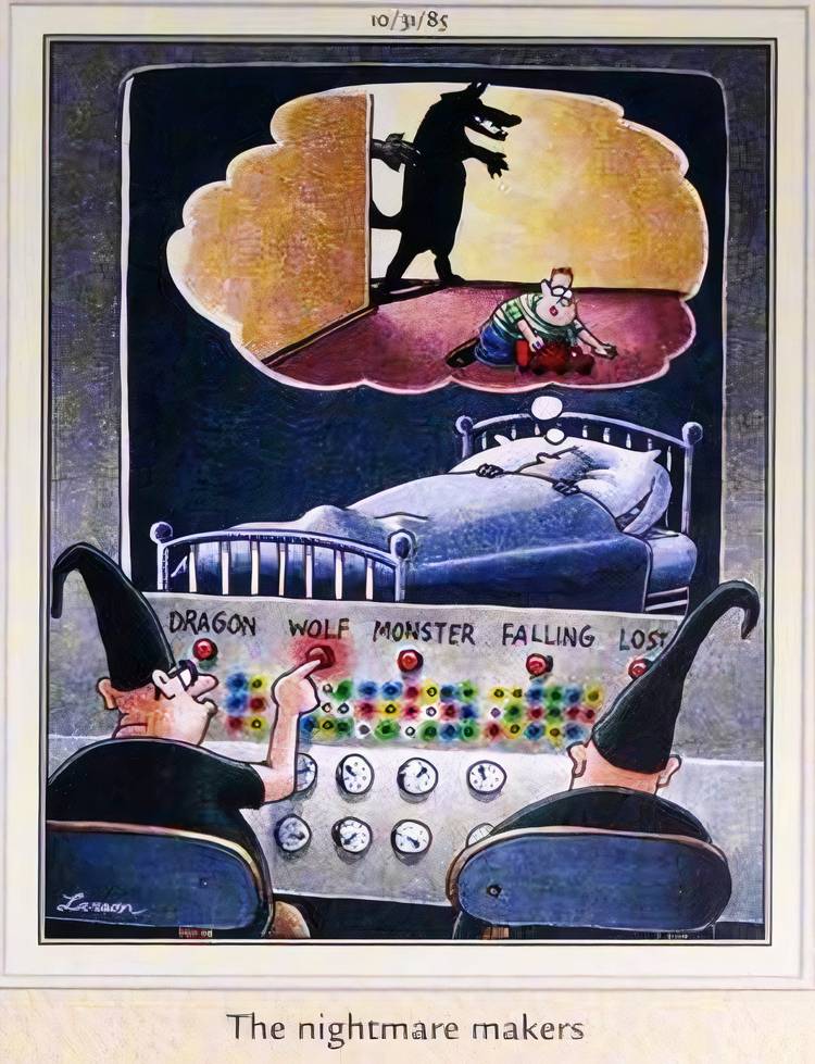 El comedia MO de Gary Larson era convertir lo ordinario en lo escandaloso, lo que a menudo implicaba tomar una premisa familiar de base y empujarla a un territorio fantástico y exagerado. Que está en exhibición aquí, en una caricatura subtitulada “los fabricantes de pesadillas“que presenta un par de personas con sombrero negro en una estación de control, enviando un sueño aterrador a un niño dormido.