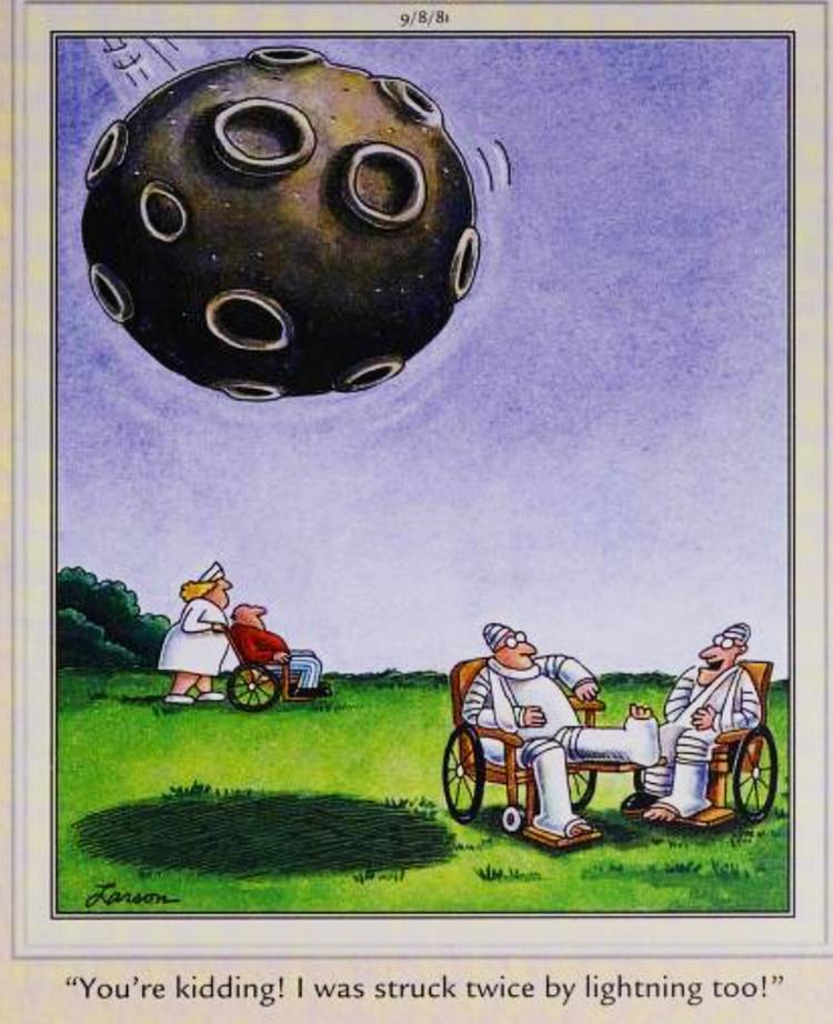 Sin embargo, sobre todo, es el epítome de El lado lejano Pencante por la ironía tragicómica. En el panel, dos hombres con moldes de cuerpo completo Comisionar sobre el hecho de que ambos eran “golpeado dos veces por un rayo“Una hazaña estadísticamente casi imposible, justo cuando un meteorito gigante ruge fuera del cielo, se dirigió directamente a ellos.
