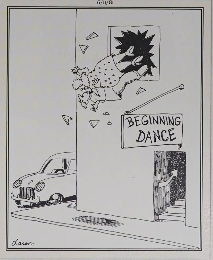 Este panel sin subtítulos en el lado lejano una vez en contra de que demuestra la comedia física de dibujos animados que pasaría a un elemento básico de Los Simpsons. Aquí, Dos personas se engaño como parte de A “baile para principiantes“Lección saca un encabezado por una ventana de segundo piso, con Gary Larson capturándolos chocando por el vasoperfectamente yuxtapuesto con el letrero para la clase.