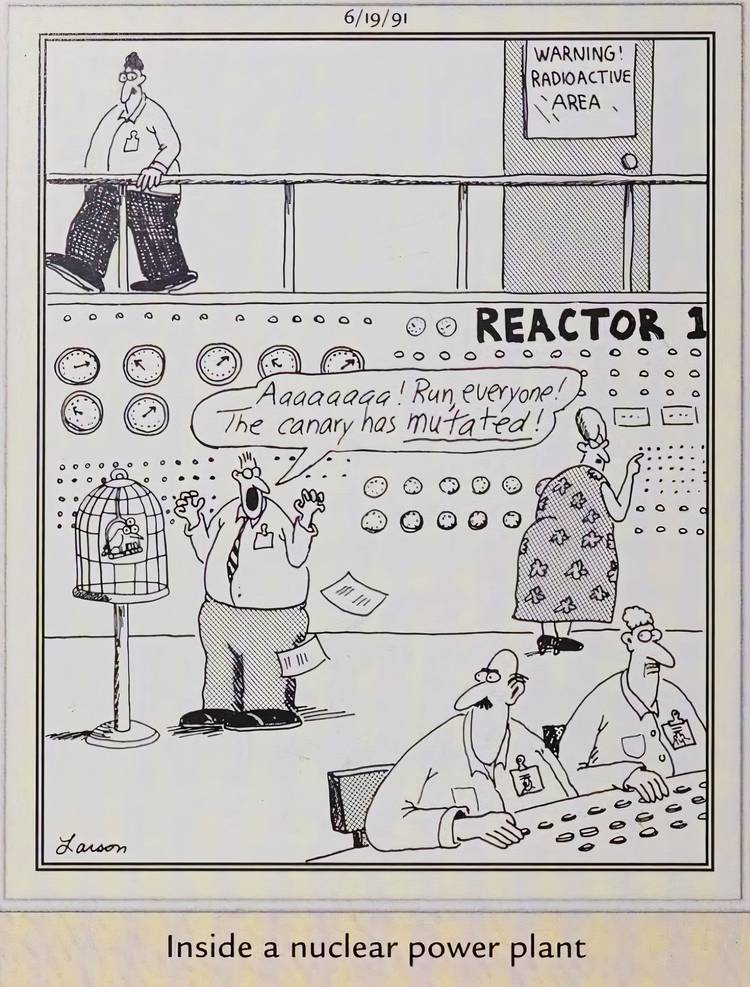Este icónico Lado lejano Características del panel Dos hombres con trajes de peligro que toman una disputa en el lugar de trabajo en una muy peligrosa “área radiactiva“y posteriormente rasgar el equipo de protección del otroexponerlos a radiación potencialmente letal. Es una broma absurda, una que requiere una falta irreal de apuestas, que el medio de dibujos animados proporciona.